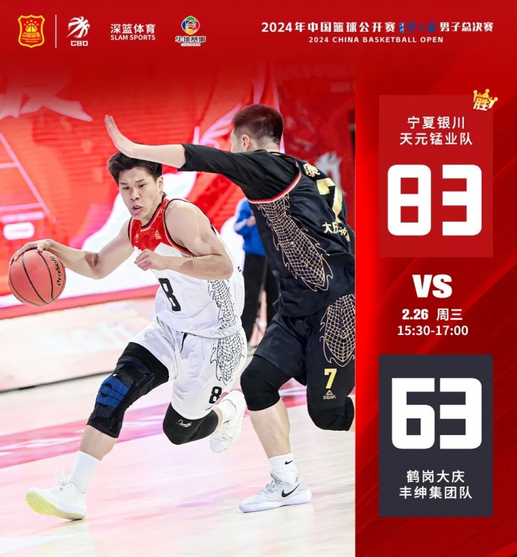 上半場,寧夏天元錳業(yè)一波7-0開局,打停大慶豐紳集團。暫停回來,寧夏天元錳業(yè)在搶到后場籃板后,積極組織快攻,11-1寧夏天元錳業(yè)領先。隨后大慶豐紳集團增強防守,同時手感開始回暖,但寧夏天元錳業(yè)在前后場籃板和進攻上發(fā)揮的更加出色。半場結束,寧夏天元錳業(yè)44-24大慶豐紳集團。下半場,寧夏天元錳業(yè)繼續(xù)保持進攻勢頭,最終天元錳業(yè)83-63大慶豐紳集團。