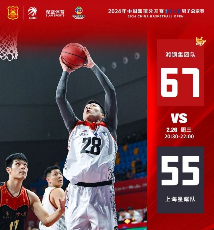 上半場開始,湘鋼集團進攻十分強勢,取得9-4領先。26號陳雙、28號蔡士港相繼投籃命中,上海星耀出現(xiàn)失誤,首節(jié)湘鋼集團24-11領先上海星耀。次節(jié),上海星耀加強防守并在籃板的拼搶中更積極主動。但湘鋼集團沒有給其太多機會,半場結束,湘鋼集團領先上海星耀16分。下半場,兩隊沒有拉開太大分差,依靠上半場的領先優(yōu)勢,湘鋼集團以67-55戰(zhàn)勝上海星耀。