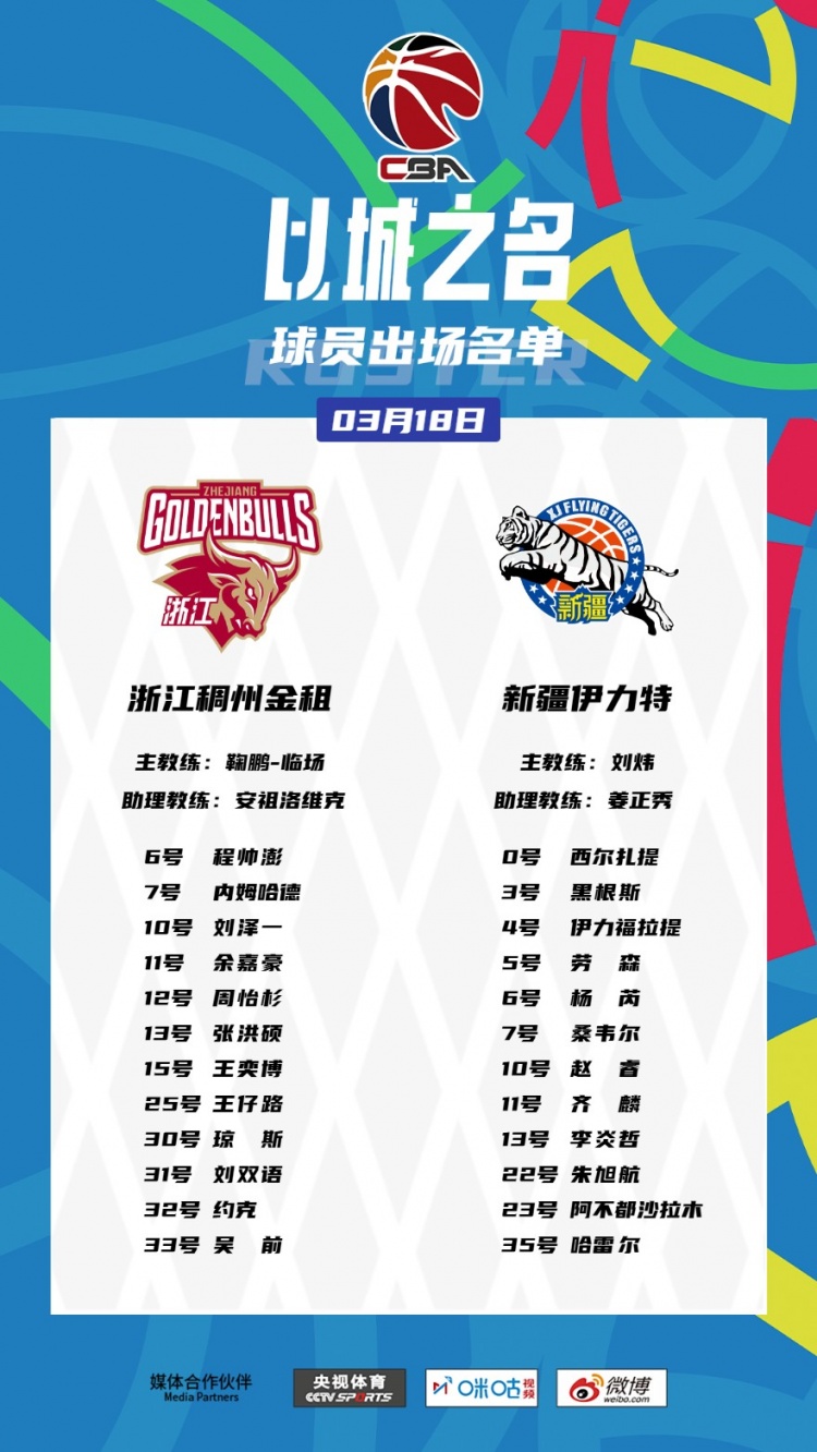 新疆大名單:西爾扎提、黑根斯、伊力福拉提、勞森、楊芮、桑韋爾、趙睿、齊麟、李炎哲、朱旭航、阿不都沙拉木、哈雷爾
