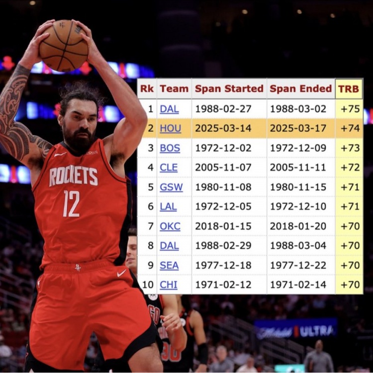 火箭過去3場(chǎng)比對(duì)手多搶74個(gè)籃板 為任何3場(chǎng)比賽區(qū)間歷史第2多