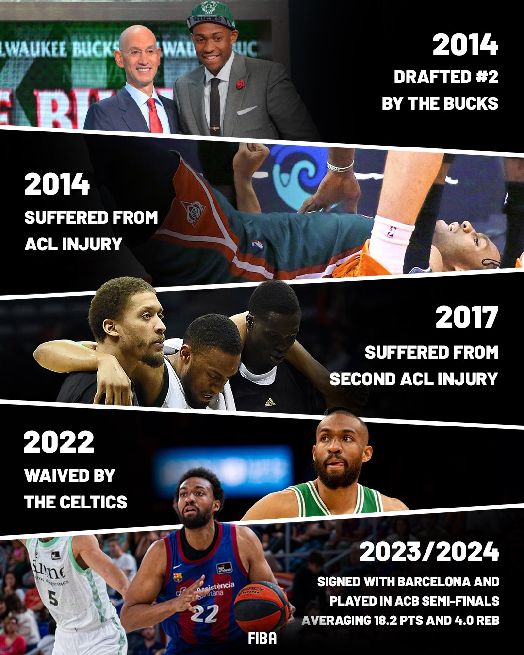 2017年第三個(gè)賽季左膝前十字韌帶再次斷裂,賽季報(bào)銷。2021-22年期間被凱爾特人裁了2次,2023-24年簽約西班牙巴塞羅那俱樂(lè)部,半決賽場(chǎng)均18.2分4籃板。