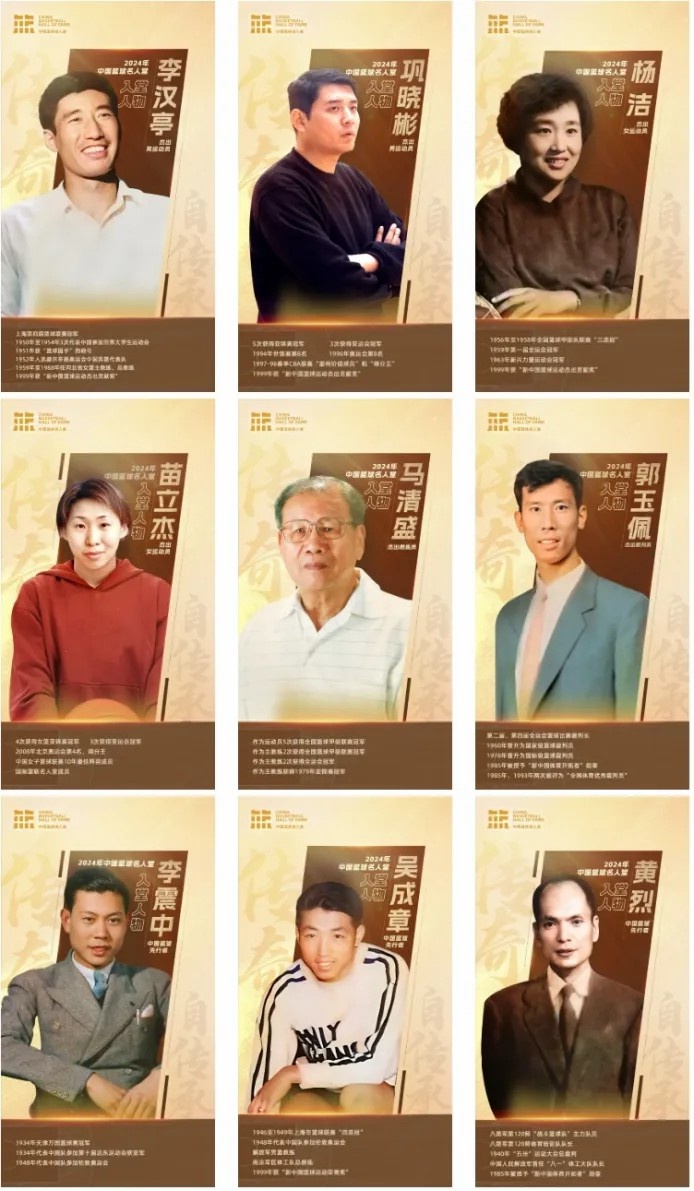 2024年中國籃球名人堂共產(chǎn)生9位入堂人物,杰出男運動員為:李漢亭、鞏曉彬;杰出女運動員為:楊潔、苗立杰;杰出教練員為:馬清盛;杰出裁判員為:郭玉佩;中國籃球先行者為:李震中、吳成章、黃烈。
