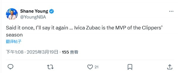對(duì)此,美記Shane Young發(fā)推寫道:“再說(shuō)一次,我還會(huì)繼續(xù)說(shuō)——祖巴茨就是快船本賽季的MVP!”