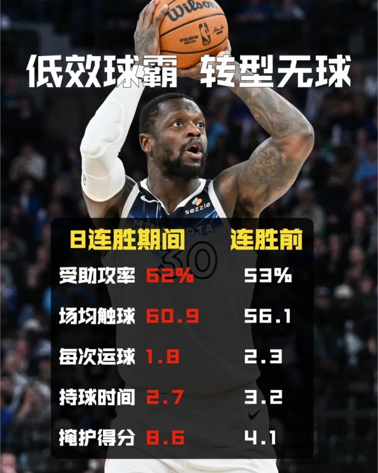 開啟連勝期間,蘭德爾提升了持球的效率,他平均每場(chǎng)比賽可以送出5.8次助攻,5.8/2.9的助攻失誤比,遠(yuǎn)比連勝之前的4.4/2.8好得多。
