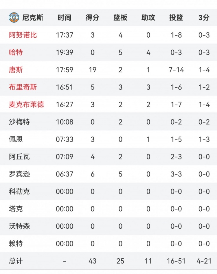 半場比賽,尼克斯首發(fā)除了唐斯以外都表現不佳,投籃共計24中3,共得到11分。