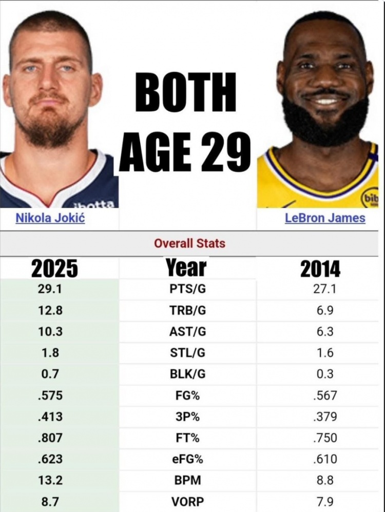 29歲約基奇場均29.1分12.8板10.3助1.8斷 各項數(shù)據(jù)皆>同期詹姆斯