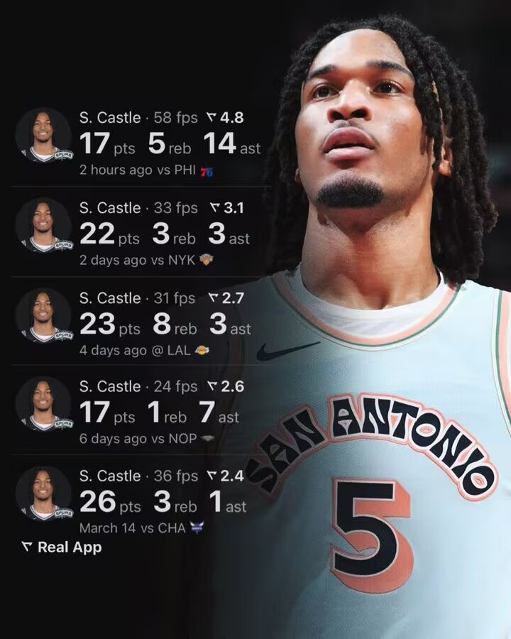 最佳新秀穩(wěn)了?卡斯爾過去5場場均21分4板5.6助 真實命中率56%