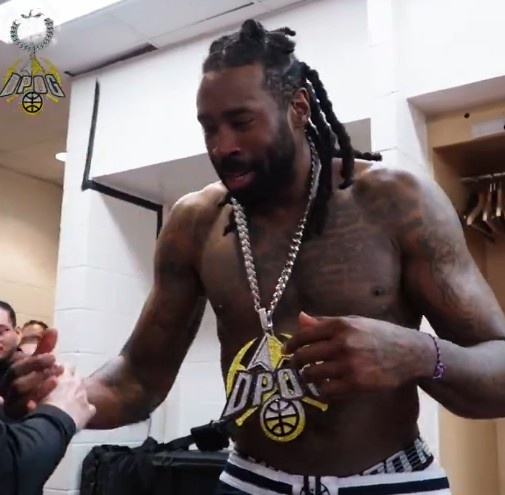 賽后,主教練馬龍?jiān)诟率覍⒋肀緢?chǎng)最佳防守球員(DPOG)的大金鏈子頒給了小喬丹。