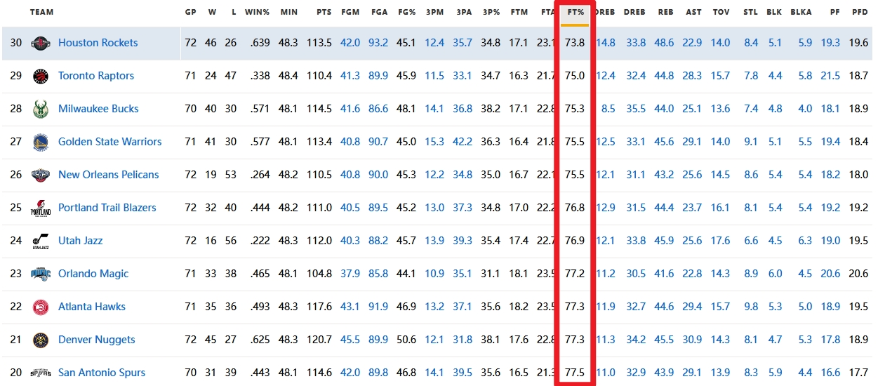 賽季至今,火箭場均23.1次罰球,命中率僅有73.8%,聯盟倒數第一。