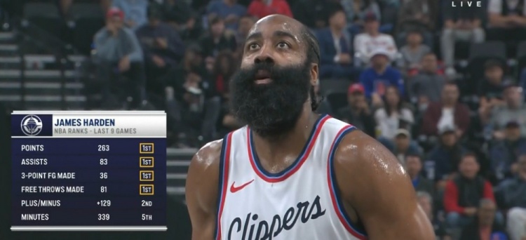 過去9場(chǎng)哈登263分、83助、命中36記三分、罰中81球皆聯(lián)盟第一;總正負(fù)值+129第二,出戰(zhàn)339分鐘第五