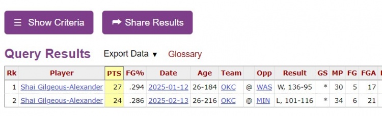 根據(jù)數(shù)據(jù)統(tǒng)計,亞歷山大今天的命中率(24.1%)是賽季至今的最低,本場比賽之前,SGA有過兩場命中率低于3成的比賽,一場是對陣奇才17中5(29.4%),一場是對陣森林狼21中6(28.6%)。