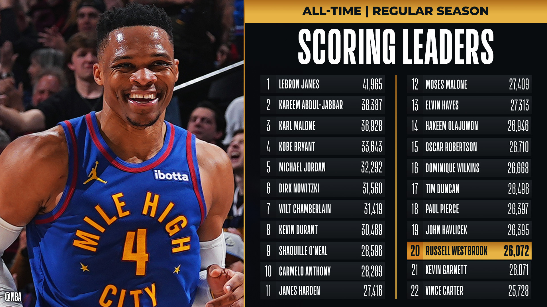 威少今日姍姍來遲,得分正式進入歷史前20!這樣一來,雷霆三少得分全部進入歷史前20!