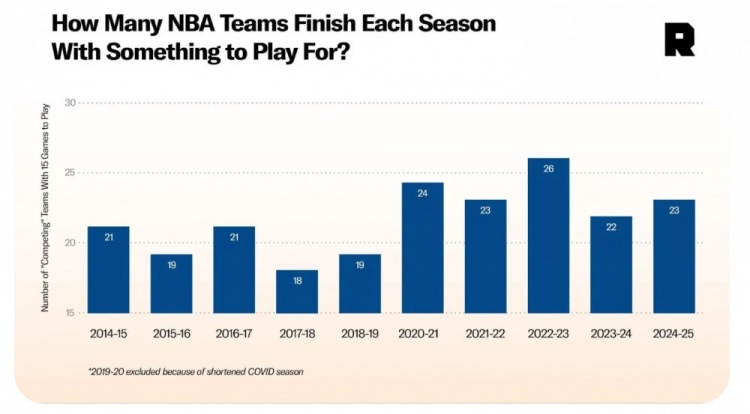 事實上,過去五個賽季的數(shù)據(jù)顯示,在常規(guī)賽剩余15場時,平均每年仍有23.6支球隊保有至少爭奪附加賽席位的希望。其中2022-23賽季尾聲階段多達26支球隊保有競爭資格,而上賽季同期最低也有22支。相比此前五年(2014-15賽季至2018-19賽季)19.6支球隊的平均值,新版制度讓競爭球隊數(shù)量提升了整整4支,畢竟參與季后賽的名額從16個擴充到了20個(含附加賽)。但關鍵在于,這一改變確實激勵了第11名及之后的球隊保持斗志。從效果來看,目標基本達成了。