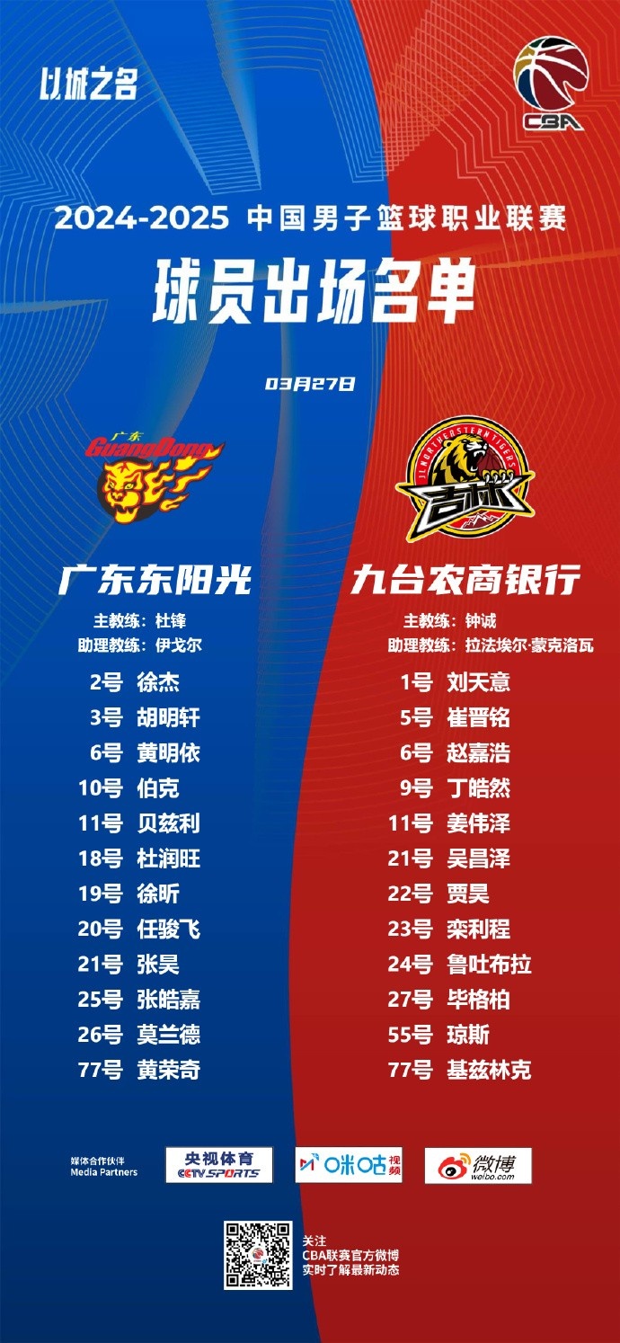 - 廣東VS吉林大名單:徐杰胡明軒姜偉澤領(lǐng)銜 吉倫沃特繼續(xù)缺陣