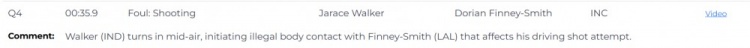 比賽最后35.9秒,湖人118-119落后一分,步行者球員賈雷斯-沃克防守時(shí)半空中轉(zhuǎn)身,與芬尼-史密斯發(fā)生非法身體接觸,影響了后者的上籃出手,此為犯規(guī)漏吹,芬尼-史密斯應(yīng)該獲得兩罰。