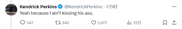 帕金斯隨后還在自己的推特上補充說:“是的,因為我不想拍他馬屁?!?/p>