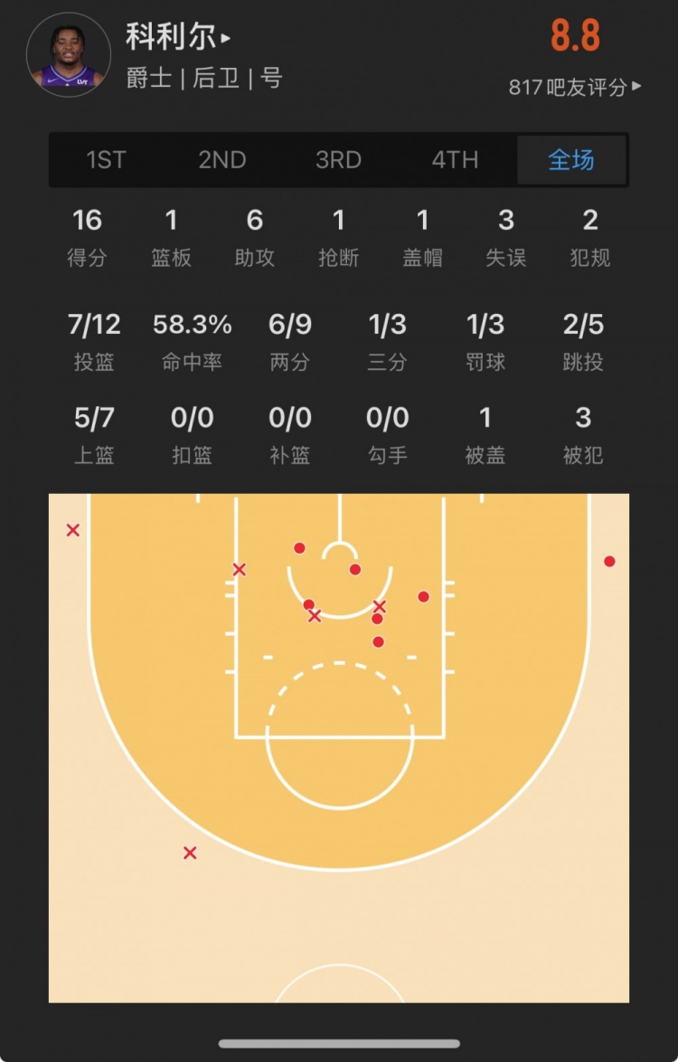 爵士29號(hào)秀 以賽亞-科利爾 登場(chǎng)30.6分鐘