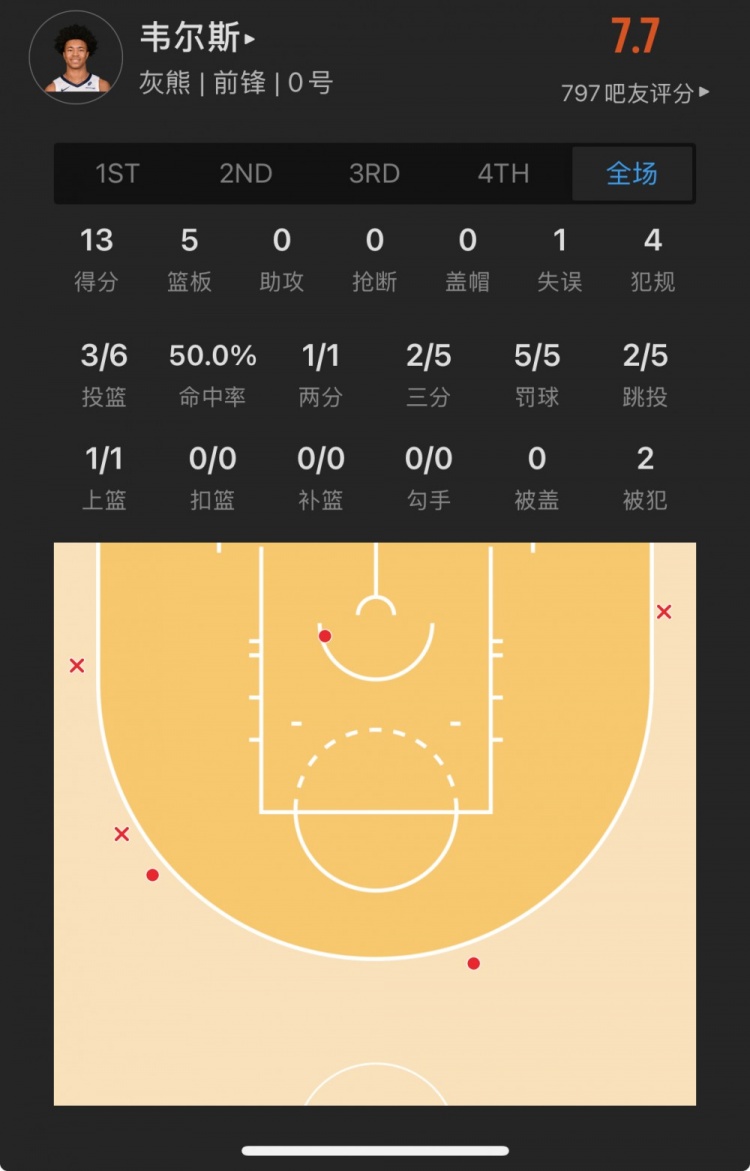 灰熊39號(hào)秀 杰倫-韋爾斯 登場(chǎng)28.2分鐘