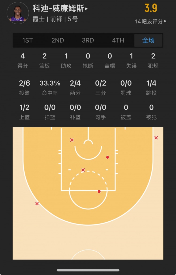 爵士10號(hào)秀 科迪-威廉姆斯 登場(chǎng)20.4分鐘