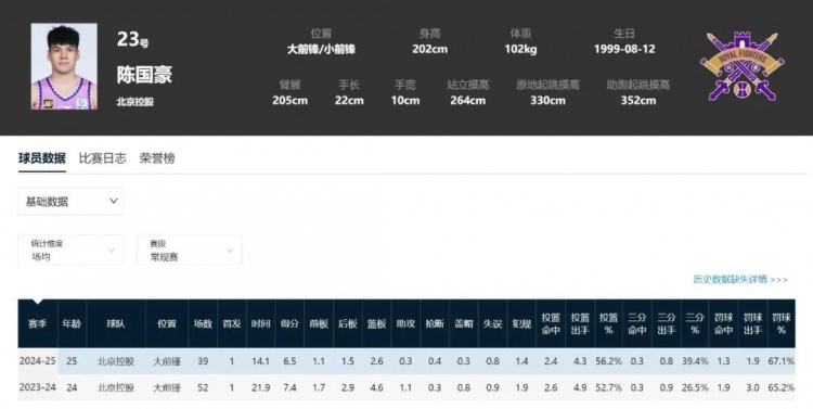 陳國豪今年效率還行,但出場(chǎng)機(jī)會(huì)被薩林杰+沈梓捷進(jìn)一步擠壓