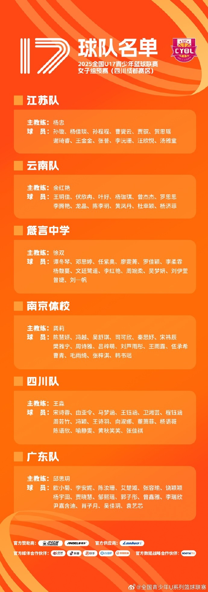 4月7日-13日,2025全國U17青少年籃球聯(lián)賽女子組預(yù)賽將分別在四川成都賽區(qū)和河北秦皇島賽區(qū)同時進(jìn)行,參賽隊伍、運(yùn)動員名單如下: