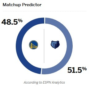 ESPN給出了本場比賽勝率預測,其中勇士48.5%,灰熊為51.5%。