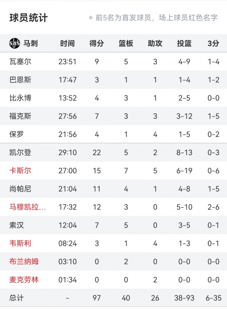 本場比賽,馬刺首發(fā)球員均表現(xiàn)低迷、沒有人得分上雙。具體如下: