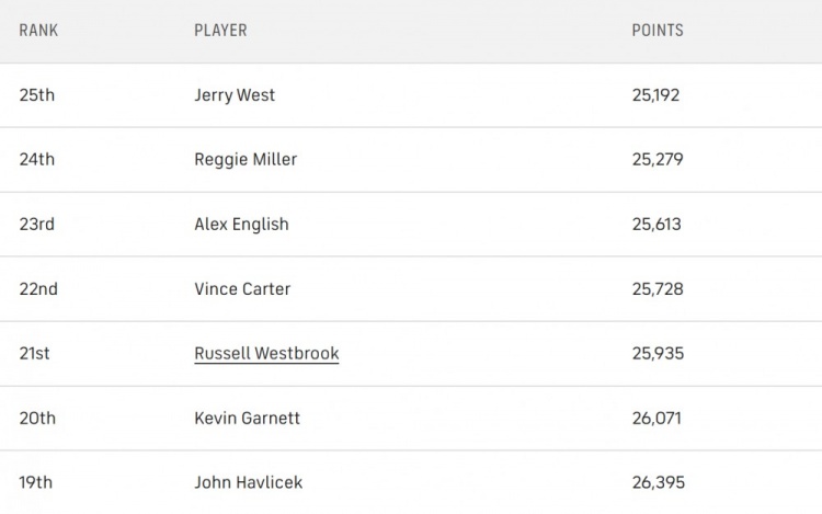 庫里距離第20位的加內(nèi)特還差1054分,因此只要他保持相對健康(參考上賽季庫里在74場比賽中得到1956分),應(yīng)該能在下賽季輕松超越加內(nèi)特。當(dāng)然,威少仍然是現(xiàn)役球員,并且會先于庫里超越加內(nèi)特,因此庫里需要再超越哈弗利切克才能進(jìn)入前20名。為此,他需要再得到1379分,這對庫里來說也不成問題。