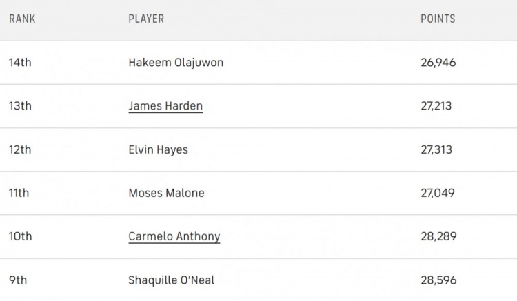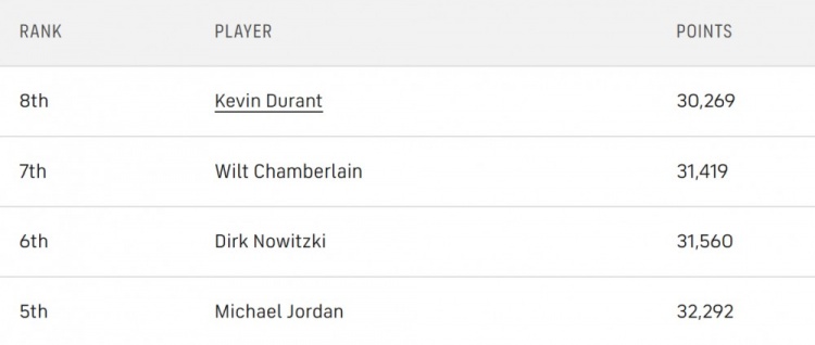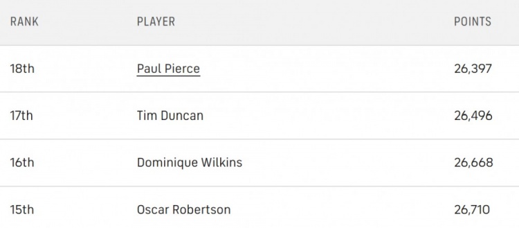 庫里是否有機(jī)會再超越其他人?或者達(dá)到30000分里程碑?以下是目前得分榜第8到第5位的情況: