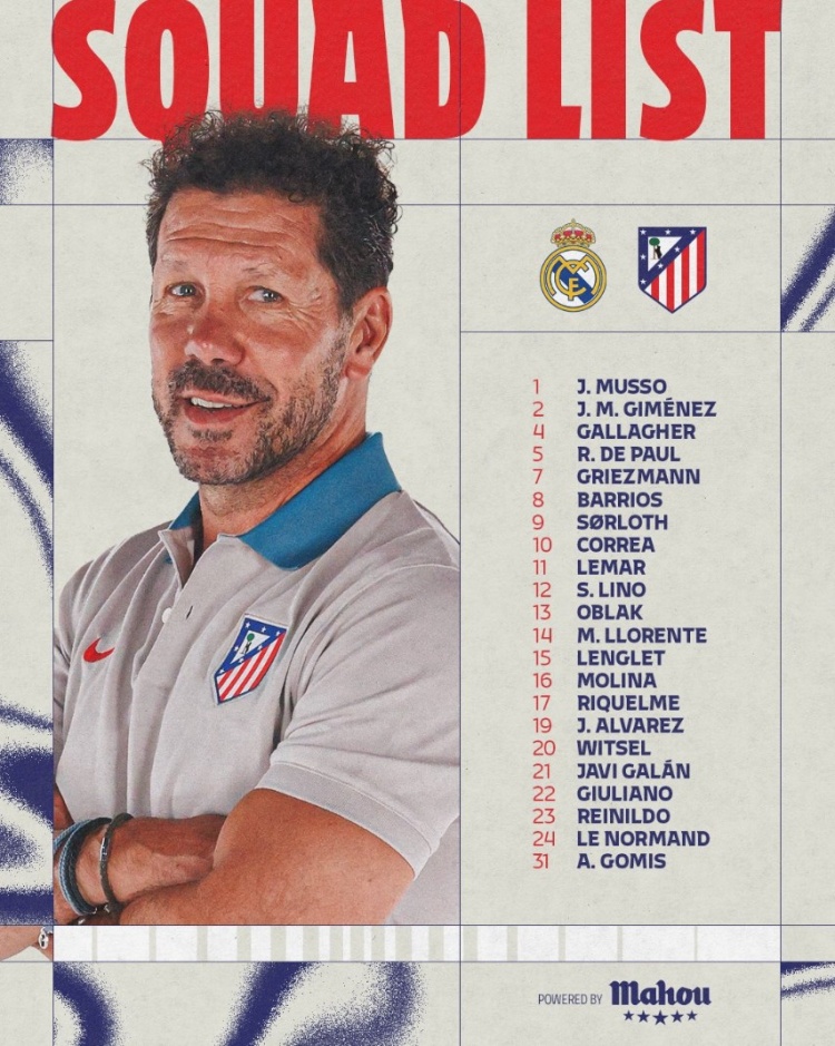 馬競公布戰(zhàn)皇馬名單:小蜘蛛&格列茲曼領(lǐng)銜鋒線,德保羅坐鎮(zhèn)中場