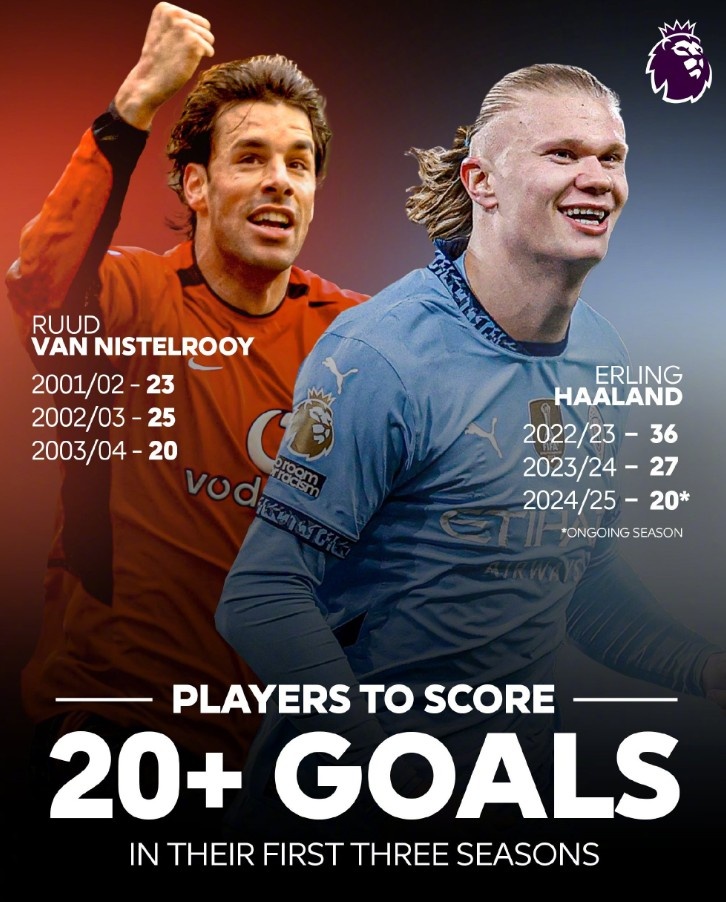 英超歷史只有兩名球員生涯前三賽季進(jìn)球20+:分別是范尼和哈蘭德
