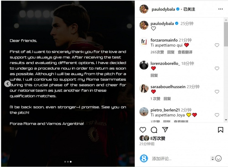 迪巴拉社媒:評估選擇之后決定接受手術(shù),將為羅馬和阿根廷隊加油