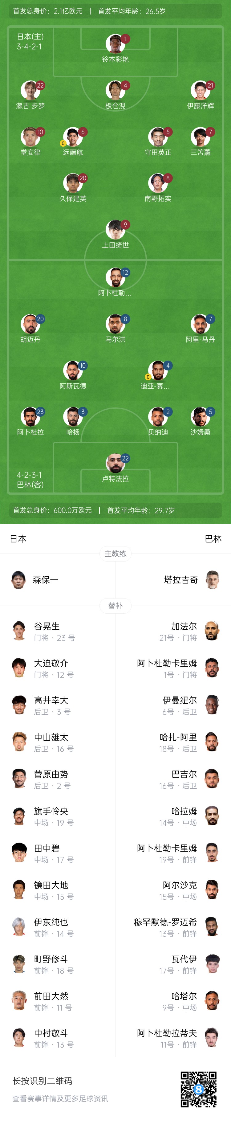 03月20日訊 北京時間18點(diǎn)35分,世預(yù)賽亞洲區(qū)第三階段C組第7輪,日本vs巴林,賽前雙方首發(fā)公布!本場比賽日本隊(duì)贏球即可提前晉級2026世界杯。