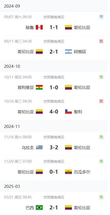 哥倫比亞在世預賽已經(jīng)遭遇3連敗,而在其美洲杯決賽不敵阿根廷之后,球隊在近7場比賽只取得2勝1平4負。具體戰(zhàn)績如下:
