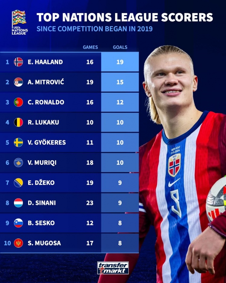 3月21日訊 歐國聯(lián)賽事戰(zhàn)火重燃,《轉(zhuǎn)會(huì)市場》也統(tǒng)計(jì)了歐國聯(lián)歷史射手榜,哈蘭德居首。