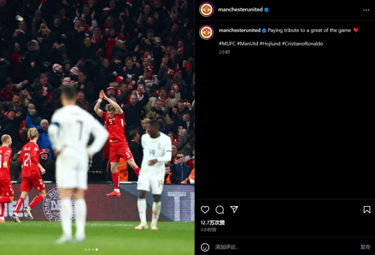 曼聯(lián)官方曬出了霍伊倫在C羅面前慶祝時(shí)的照片,并寫道:向偉大球員致敬?。
