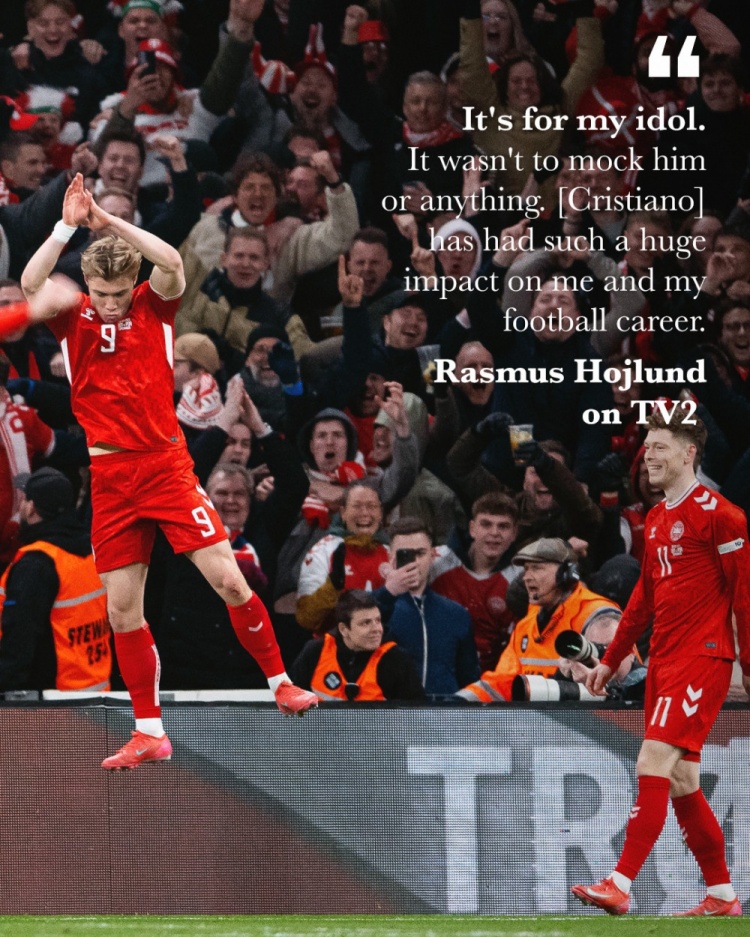 3月21日訊 歐國(guó)聯(lián)1/4決賽首回合中,丹麥1-0擊敗葡萄牙,霍伊倫破門后模仿了C羅標(biāo)志性的Siu慶祝動(dòng)作。
