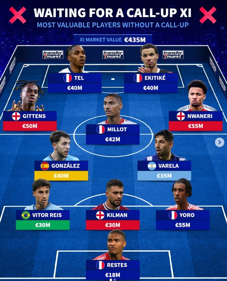 3月22日訊 本月的國家隊比賽正在進行中,《轉會市場》也列出了仍未獲得國家隊征召的當前最貴陣,法國5將在列。