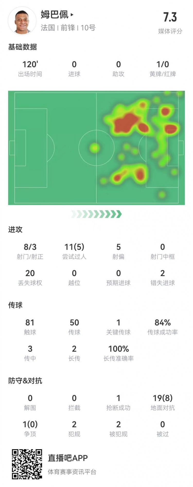 姆巴佩本場8射3正+2失良機+點射命中 20對抗8成功+20丟失球權(quán)