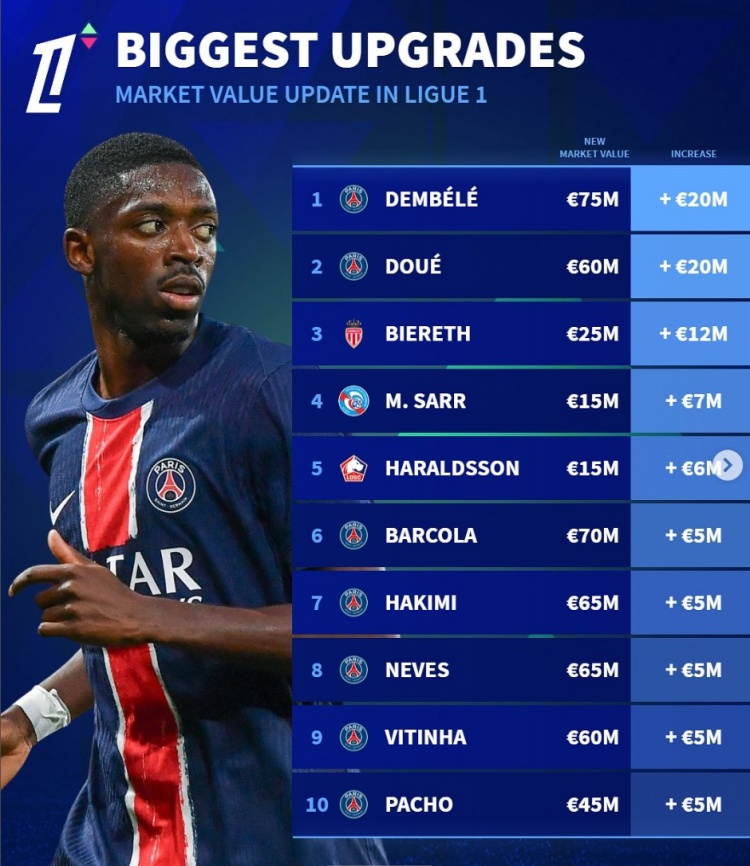 法甲身價(jià)更新升值榜:登貝萊&杜埃均上漲2000萬(wàn)歐,比雷斯在列