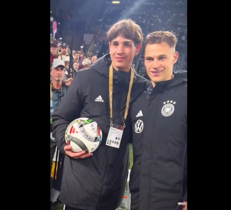值得一提的是,現場的德國球童第一時間將足球拋給基米希,在很大程度上幫助實現了這一進球?;紫R苍谫惡笳业竭@位球童,為其送上簽名足球并合影鼓勵。