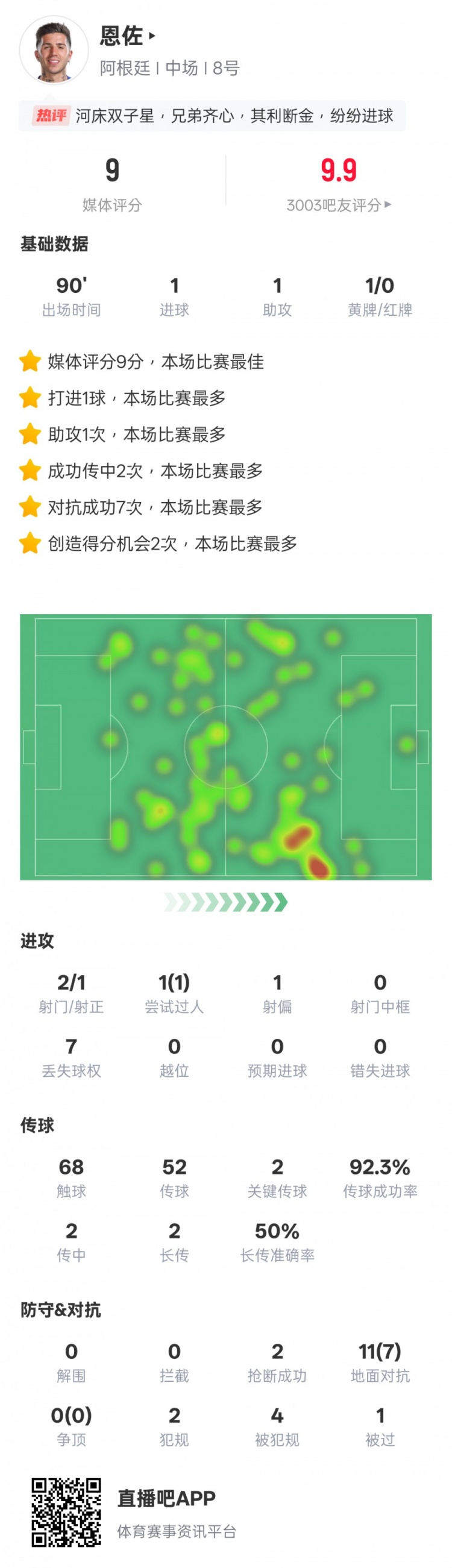 - 恩佐本場數(shù)據(jù):傳射建功+2關(guān)鍵傳球,評分9.0全場最高