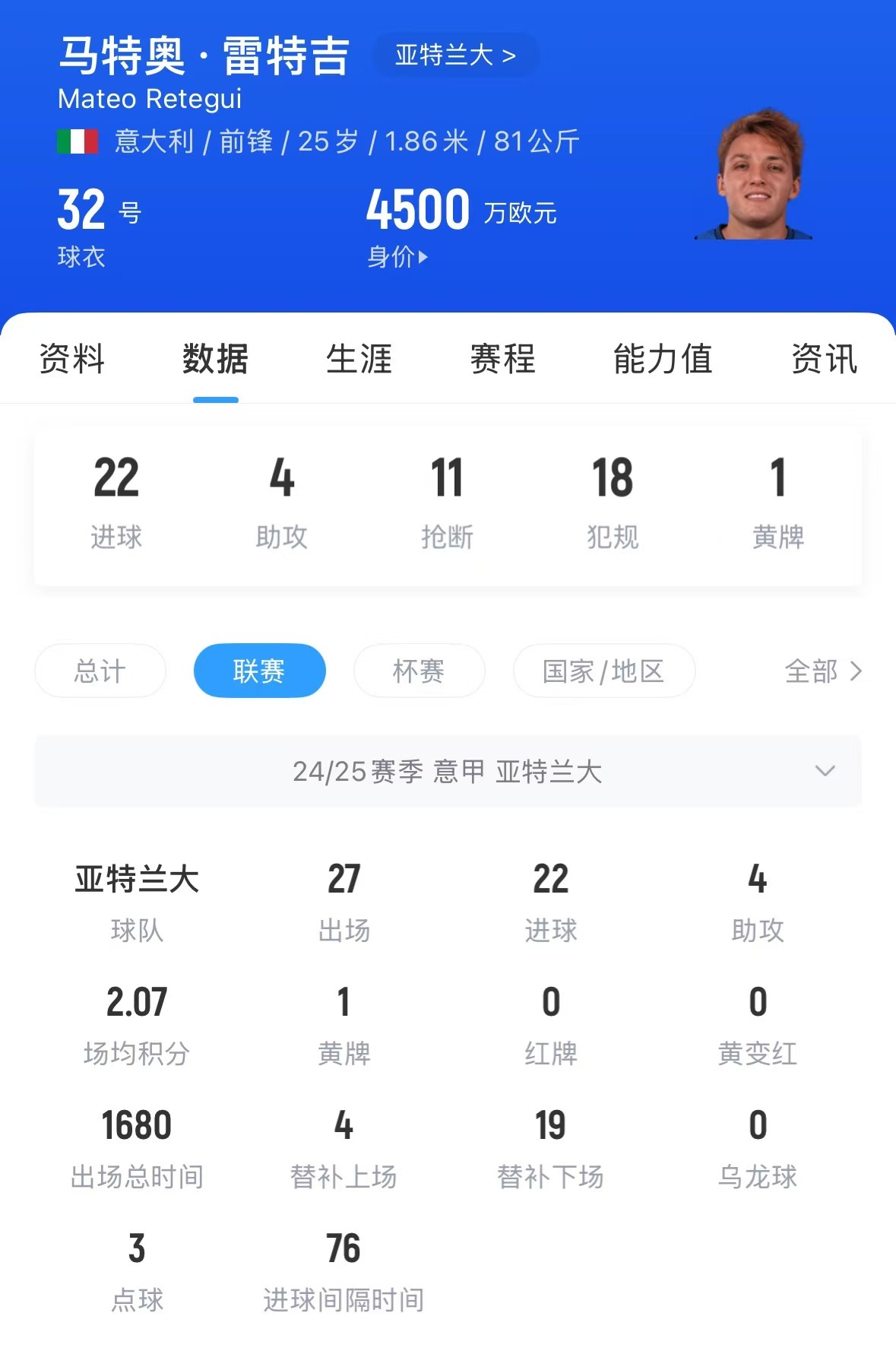 本賽季25歲的雷特吉表現(xiàn)出色,27輪意甲打進22球,斷層領跑聯(lián)賽射手榜,領先第二的小基恩7球,并幫助亞特蘭大排在意甲第三。