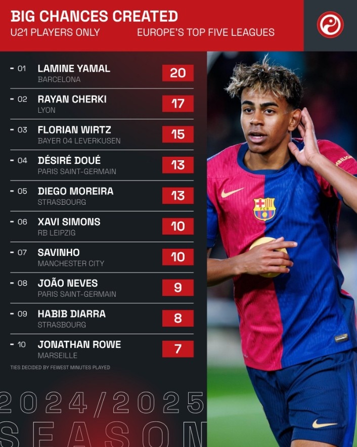 本賽季五大聯(lián)賽U21創(chuàng)造重大機會排行top10: