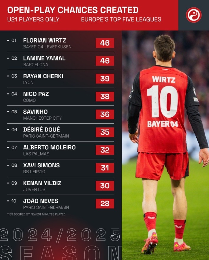五大聯(lián)賽U21運動戰(zhàn)創(chuàng)造機會排行:亞馬爾、維爾茨46次并列榜首
