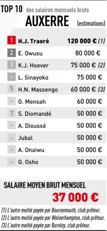 因此,歐塞爾俱樂(lè)部(AJA)雖然僅需承擔(dān)以下租借球員月薪的一半:由伯恩茅斯租借的科特迪瓦進(jìn)攻中場(chǎng)哈梅德·朱尼爾·特拉奧雷(25歲,歐賽爾承擔(dān)24萬(wàn)歐元中的12萬(wàn))、由狼隊(duì)租借的荷蘭右后衛(wèi)基-加納·霍福爾(23歲,歐賽爾承擔(dān)15萬(wàn)歐元中的7.5萬(wàn)),以及由伯恩利租借的中場(chǎng)漢-諾阿·馬森戈(23歲,歐賽爾承擔(dān)12萬(wàn)歐元中的6萬(wàn)),馬森戈是合同中唯一包含買(mǎi)斷選項(xiàng)的球員,這個(gè)價(jià)格也使得這三位球員分別位列俱樂(lè)部薪資榜的第一、第三和第五位。
