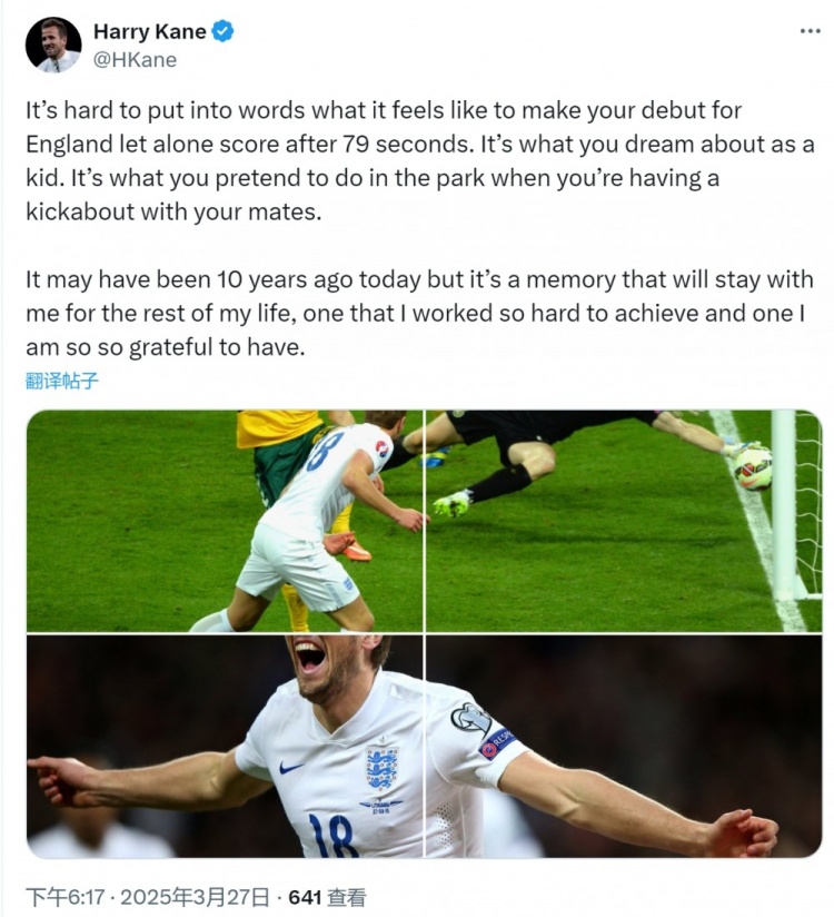 3月27日訊 凱恩更新社媒動(dòng)態(tài),紀(jì)念自己上演英格蘭隊(duì)首秀10周年。