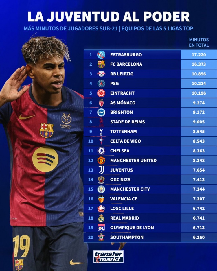 - 五大聯(lián)賽球隊(duì)U21出場(chǎng)時(shí)間榜:斯特拉斯堡、巴薩、萊比錫前三