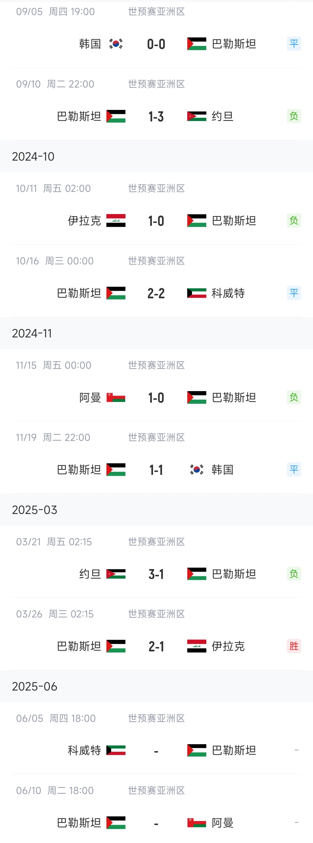 18強賽B組積分榜上,巴勒斯坦積6分排名小組第5,依然存在小組前四晉級附加賽的希望。在18強賽前8輪比賽中,巴勒斯坦取得1勝3平4負,其中兩回合交手韓國隊均取得平局。