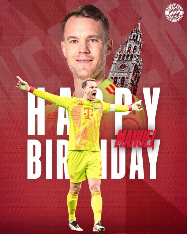 諾伊爾出生于1986年3月27日,今天是這位德國門將的39歲生日,拜仁官方發(fā)海報(bào)送上生日祝福。本賽季,諾伊爾已為拜仁出戰(zhàn)33次,目前在養(yǎng)傷中。